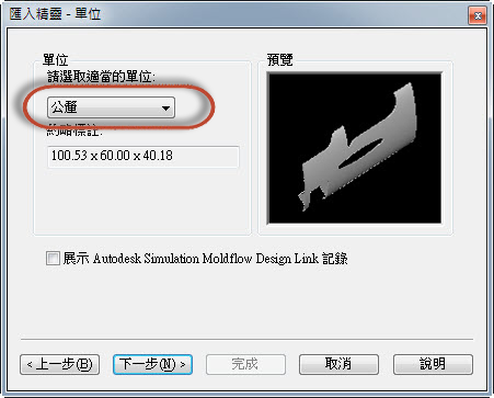 按一下「確定」,以檢閱 Autodesk Simulation Moldflow Design Link 選項。