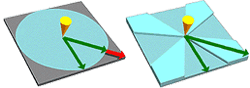 下圖為厚度均勻的方形板,且聚合物射出位置位於中心,將會示範流動。左圖的零件展示了充填不平衡的徑向流動陣列,它會導致較早充填的區域過度保壓,進而引發變形問題。在右圖的零件中,已從零件中心到轉角增加板的厚度,如此可減少這些方向的流動阻力