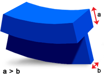 下圖 (a) 展示中心澆口式圓盤的鞍狀翹曲,澆口周圍的收縮較高。相反地,如果圓盤外部周圍的收縮較高,產生的翹曲可導致圓盤呈圓頂狀,如圖 (b) 所示。