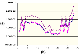 此圖顯示平行於聚丙烯流動方向的已測量實驗性收縮。也顯示了平行收縮理論上計算的值 (使用熱黏彈性模型) 與平行收縮的修正值。很明顯,修正的值與測量的值相當一致。下圖對相同聚丙烯垂直方向的相似改進狀況進行了說明。