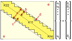 帶狀勁度矩陣顯示勁度矩陣的外觀。在 (大部分) 非零項與所有零項之間的邊界名為天際線。主對角線與天際線之間的係數組稱為曲線。由於矩陣