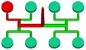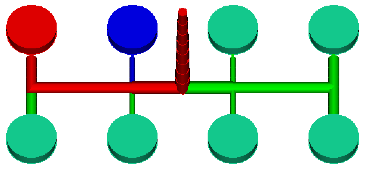 下圖顯示人為平衡的 8 母模仁工具。這種流道系統包含兩種不同流徑 (分別以紅色和藍色表示),因此出現次數與第一個範例不同。