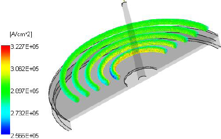 來源電流密度結果是實際感應線圈本身中的電流出圖。它會顯示產生感應加熱的輸入電流。
