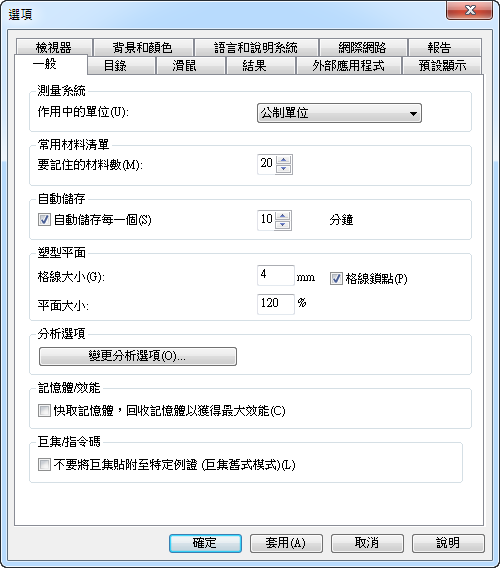 」頁籤可讓您規劃系統設定、所用顯示顏色、塑型環境設定、模型匯入目錄、記住的常用材料數以及分析選項設定。