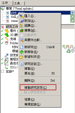 您可以在不同研究之間複製研究設定,而不必從頭開始設置新研究,可以比較在相同條件下執行的不同模型,或者由於多數設定都相同,您只需變更一或兩個設定。藉由此工具,您可以複製研究設定:
