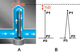對障板管的塑型方法是建立兩個圓形樑元素,頂部留有間隙以供冷卻劑在周圍流動。第一個圓形元素表示在障板管一側向上流動,而第二個元素則表示在另一側向下流動。黃色是指定給障板管的預設顏色。在下圖中,A 展示障板管剖面,B 展示模具模型表現法。障板管由 HTE (熱傳導效果) = 0.5 的兩個圓形樑元素組成。