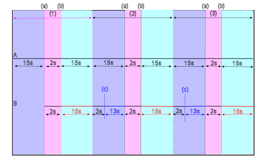 在此模式下,會在指定的時間長度之內加熱與冷卻模具。您可以透過適當地設定時間來選取在模具開啟還是關閉時對其進行加熱。例如,在下圖中,會在模具關閉時 (如紅色的 15s 所示) 對其進行加熱:
