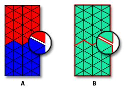 在「網格連接診斷」亮顯報告中,連接至所選元素的所有元素都會以紅色顯示,而斷開連接的元素會以藍色顯示。如下面的圖 A 所示,元素的一半並未連接至另一半。在未連接元素的交點處,還存在自由邊 (圖 B)。「自由邊」診斷可用來找到自由邊。例如,當流道與零件斷開連接時,樑元素也可能會斷開連接。