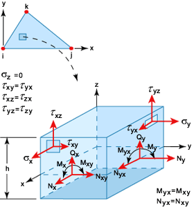 元素的彎曲公式以離散 Kirchhoff 技術的一般化為基礎,以包含橫向剪切影響。元素不會鎖定,並且可用於較厚或較薄零件的分析。如果橫向剪切影響不明顯,它會與知名的 DKT (離散 Kirchhoff 三角) 元素重合。