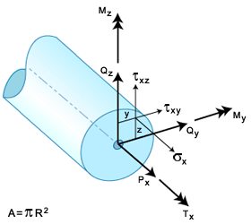 元素公式可說明軸向、彎曲、扭力及橫向剪切變形。基本假設為,樑剖面會保持平面及未變形,但在存在橫向剪切的情況下,將不會維持法向於縱軸。您可將產生的模型想像成在兩階段中從傳統 Euler-Bernoulli 樑中導出。首先,加入 Reissner-Mindlin 類型剪切模型可說明橫向剪切的平均影響。這會導致產生一般所說的 Timoshenko 樑。在第二階段中,會使用 St.Venant 的理論為扭力行為塑型。