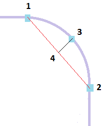 - 為了確保套用適當的邊長,線高 (下圖中的距離 3 至 4) 會除以弦長 (距離 1 至 2)。此比率的預設值為 0.05,可用範圍為 0.02 至 0.3。縮短邊長將會減少弦高,並因此減少此比率。