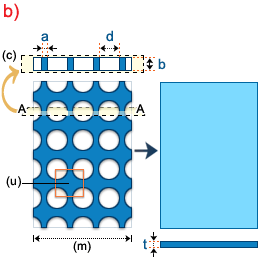 下圖展示厚板狀表面。可透過陣列的一個基本單位 (會重複) 計算出等效厚度與形狀係數。