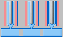 所有三個閥澆口同步開啟,會在不同饋送的會合處形成熔接線。