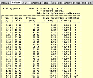 此部分包含分析進度表格,該表格提供分析中每個時間步長的表格格式結果。在充填階段,您可以看到充填的母模仁體積、母模仁中的壓力、鎖模力以及流速與分析時間的關係。保壓階段,會報告某段時間保壓的母模仁百分比。
