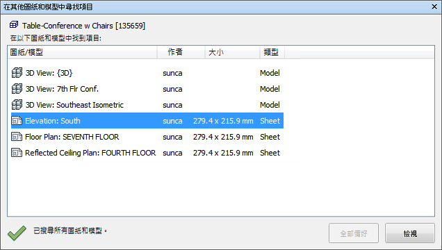 「在其他圖紙和模型中尋找項目」是可停靠的視窗,可讓您透過「專案瀏覽器」搜尋所有已準備好的圖紙/模型中的某個物件。