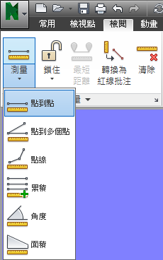 測量工具可讓您在模型中項目上的兩個點之間進行測量。所有測量都採用顯示單位。測量工具可從「審閱」頁籤 「測量」面板中取得。