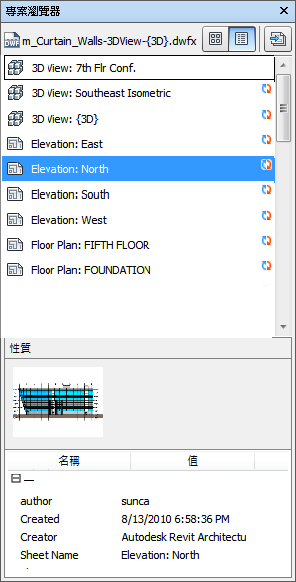 「專案瀏覽器」是一個可停靠的視窗,其中列示了目前開啟的檔案中的所有圖紙/模型。