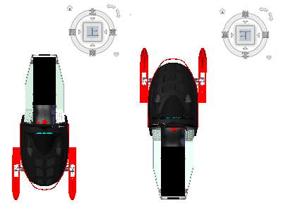 當您從其中一個面視圖檢視模型時,若 ViewCube 工具為作用中,則 ViewCube 工具附近會顯示四個直角三角形。您可以使用這些三角形來切換至其中一個相鄰面視圖。