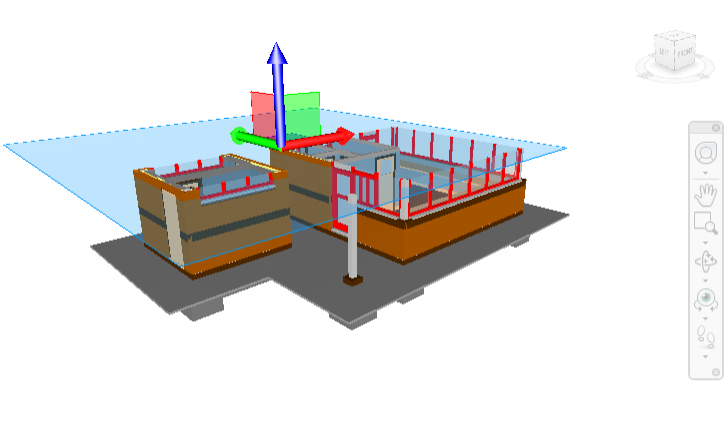Autodesk Navisworks 將開啟功能區上的「剖面工具」頁籤,並在「場景視圖」中繪製透過模型的剖面平面。平面 1 的預設對齊為「頂部」。預設位置處於模型之可見區域的中心。「移動」為預設的控點。