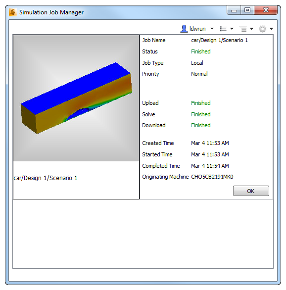 The process of copying the simulation results data from the Autodesk 360 secure storage service back to the local workstation. When the Download stage reaches Finished, the simulation is complete and results are ready for visualization on the local computer. Note, there are times when the Download stage shows as Running at the same time as the Solve stage. This is done to support download of intermediate results. |