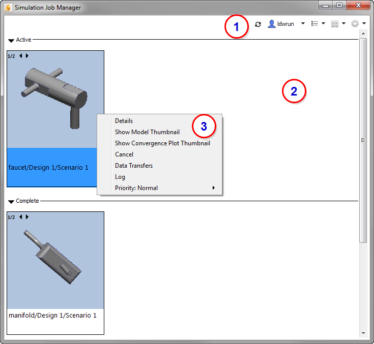 e. Set Preferences to customize how the Simulation Job Manager behaves. Additionally, you can access Help and open the About box to check the version number and the active port number.