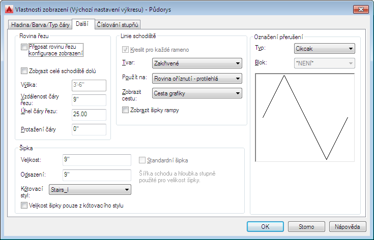 Tento postup použijte k určení dalších vlastností zobrazení pro jednotlivé schodiště, jako např. jak se zobrazí šipka v cestě, která cesta zobrazení se ukáže a jaký typ označení přerušení se má použít v zobrazení schodiště. Tyto vlastnosti zobrazení roviny řezu se vztahují jen na reprezentaci zobrazení, jako je Půdorys, která je použita v Pohled shora (půdorys) výkresu.