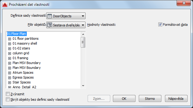| zobrazit pouze objekty, které již mají na některé hladině připojenu vybranou sadu vlastností | zrušte zaškrtnutí políčka Skrýt objekty bez definic sady vlastností. |