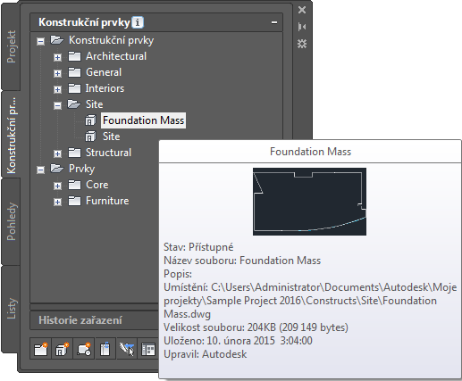 V Navigátoru projektu lze zobrazit zmenšené náhledy projektových výkresů. Náhled může obsahovat grafiku, detail nebo obojí. Zobrazení náhledů se může hodit při procházení rozsáhlého projektu s mnoha výkresy.