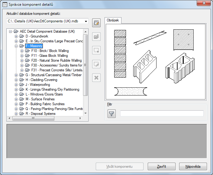 V dialogovém okně Správce komponent detailů můžete přejít do různých databází komponent detailů. Hierarchické stromové zobrazení a funkce filtrování usnadňují vyhledání jednotlivých komponent v rámci databáze. Vyhledanou komponentu, kterou potřebujete, můžete vložit do výkresu nebo ji můžete přetáhnout na paletu nástrojů, abyste ji mohli opakovaně použít. Poznámka: Pět tlačítek uspořádaných svisle uprostřed dialogového okna není k dispozici v případě, že nemáte k vybrané databázi oprávnění pro úpravy.