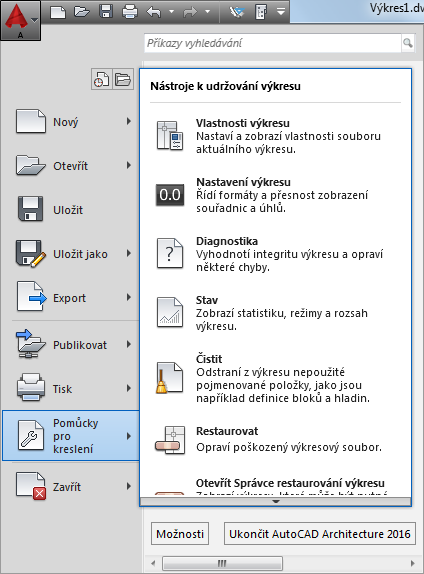 Nabídka aplikace obsahuje příkazy, které se vztahují k výkresu jako celku.