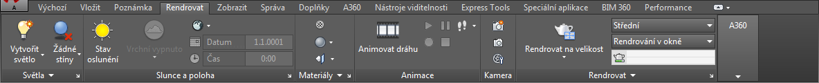 Karta Rendrování obsahuje všechny příkazy, které jsou potřebné při práci s rendrováním, materiály, světly, kamerami a animacemi.