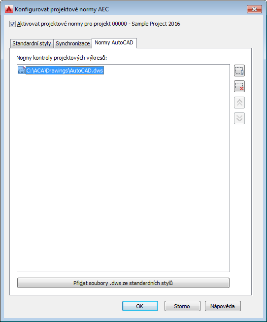 Použijte tento postup pro nastavení norem aplikace AutoCAD v projektu.