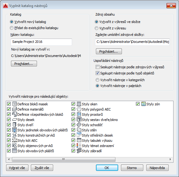 Poznámka: Pokud jsou povoleny obě možnosti, katalog je nejdříve seskupen podle výkresů, a poté podle typu objektu, přičemž kategorie budou generovány z výkresů a palety z typů objektů. Toto je implementováno, jelikož palety nemohou být vnořené. V tomto případě jsou vypnuta přepínací tlačítka pro kategorie a palety a pro katalog je vybrána možnost Vytvořit nástroje na paletách.