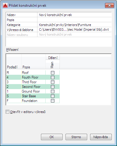 | přiřadit konstrukční prvek k hladině a dělení | v tabulce přiřazení vyberte správnou hladinu a dělení. Vyberte požadovaný řádek hladiny a sloupec dělení a zaškrtněte příslušné políčko. Poznámka: Měli byste zaškrtnout pouze jednu hladinu a dělení. Více hladin a dělení vytváří rozsahové konstrukční prvky.