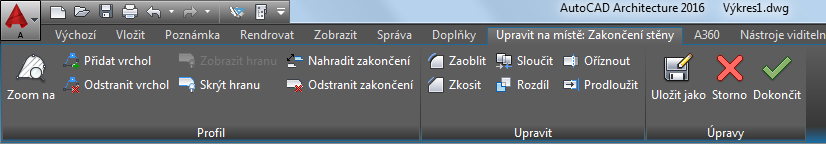 Režim úprav na místě představuje zvláštní editační režim, ve kterém lze přímo na obrazovce upravovat komponenty objektu založené na křivce nebo profilu, zatímco ostatní možnosti úprav ve výkresu jsou omezeny. Když se nacházíte v režimu úprav na místě, můžete například změnit zakončení stěny, ale nemáte možnost uložit a zavřít výkres. Po ukončení režimu úprav na místě můžete vybrat, zda se mají provedené změny zrušit, zda mají přepsat existující definici komponenty nebo zda mají být uloženy jako nová definice.