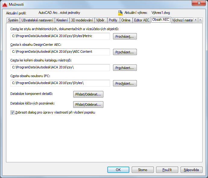 Tento postup slouží k určení výchozích možností obsahu AEC u aktuálního výkresu.