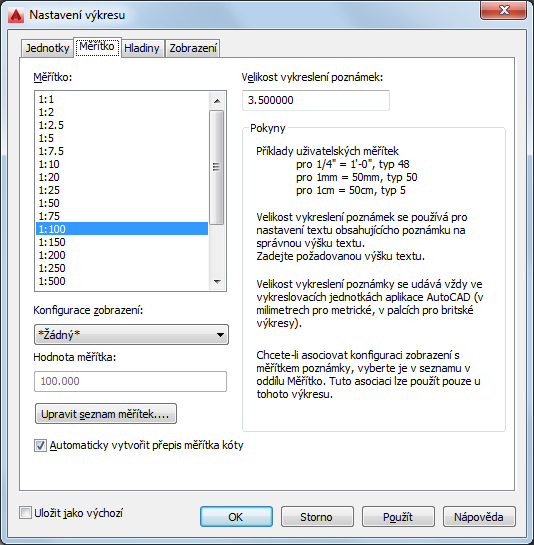 Zadání výchozích možností měřítka u aktuálního výkresu