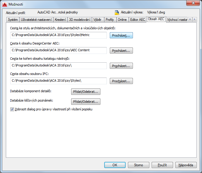 - Ukládejte soubory obsahu AEC do složky, která je uložena mimo výchozí složky „Britské“ a „Metrické“. Cesta do vašeho obsahu AEC je k dispozici v dialogu MOŽNOSTI na kartě „Obsah AEC“. Podle potřeby lze vytvářet mnoho dílčích složek v místě, které je označeno jako „Cesta obsahu AEC Design Center“. Ty budou přístupné na kartě „Obsah AEC“ v AutoCAD Design Center a budou se chovat stejně jako jiné typy obsahu AEC.