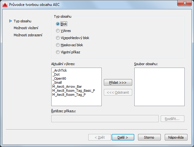 - Jestliže máte stávající 2D a 3D bloky AutoCAD, můžete je převést přímo do Obsahu AEC pomocí Průvodce obsahu AEC a výběrem možnosti „Blok“, coby typu obsahu.
