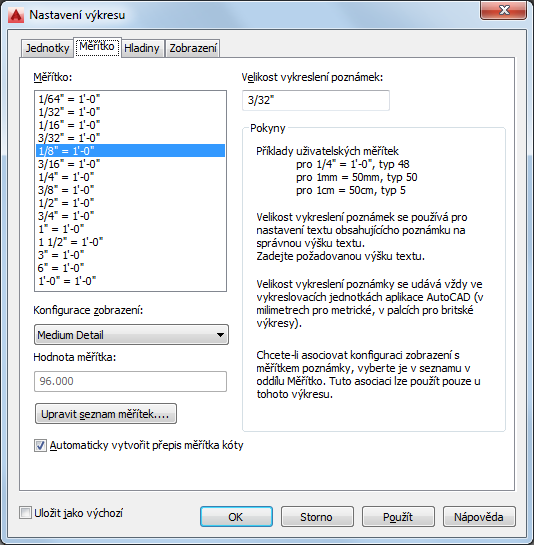 Upozornění: Zkontrolujte, zda jste nastavili parametry nastavení výkresu na automatické načtení stylu klíče hladiny do nového výkresu. To je velmi důležité pro přiřazení obsahu ke klíči hladiny.