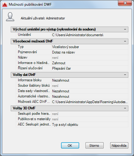 Publikovat. Jestliže není možnost <3D DWF> dostupná, nebyla pro výkres nastavena žádná platná konfigurace 3D zobrazení.