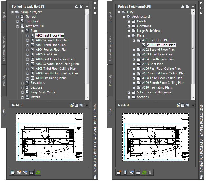 Karta List uvádějící Pohled sady listů projektu (vlevo) a Pohled průzkumníku (vpravo)
