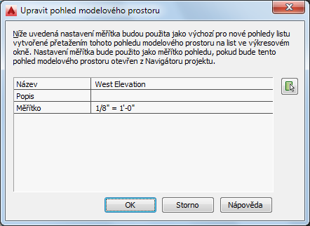 Poznámka: Pokud změníte vlastnosti pohledu modelového prostoru, nebudou aktualizovány instance tohoto pohledu, které byly vloženy jako pohledy listu do listu. Nové nastavení budou mít pouze nové instance pohledu modelového prostoru. Pokud je například definován pohled modelového prostoru pojmenovaný Západní schodiště s měřítkem 1/8” = 1’-0”, bude s tímto měřítkem vložen do listu. Pokud se list později změní na hodnotu 1/4“= 1’-0“, nebude nové měřítko v existujících pohledech listu aktualizováno, ale bude použito pro nové pohledy listu.
