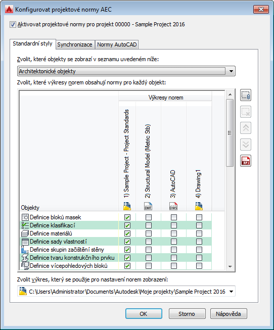 Pro nastavení stylů norem a nastavení zobrazení definujte jeden nebo více výkresů projektových norem, které obsahují normy pro styly a nastavení zobrazení. Tyto výkresy mohou být typu DWG, DWT nebo DWS a jsou přidány do dialogu konfigurace.