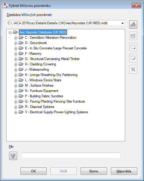 Databázi klíčové poznámky vyberte v dialogu nahoře. Databáze klíčových poznámek AEC je výchozí pro detaily komponent, zatímco databáze AecKeynote-Assemblies je výchozí pro architektonické objekty, které jsou spojením více komponent.