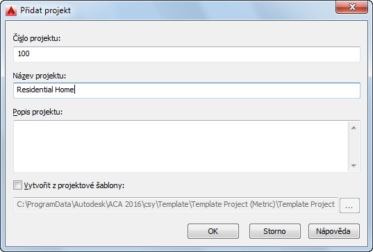 Poznámka: Přímo při vytváření nového projektu nelze zadat všechny podpůrné soubory a cesty. Definovat lze pouze název, číslo, popis a šablonu projektu. Zbývající vlastnosti jsou definovány až po vytvoření projektu. Pokud projekt vytváříte na základě šablony, budou vlastnosti šablony použity pro počáteční nastavení. Pokud vytvoříte projekt bez použití šablony, budou vlastnosti nejdříve prázdné nebo budou definovány výchozími možnostmi projektu AEC.