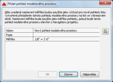 | zadat popis nového pohledu modelového prostoru | klikněte na nastavení pro Popis a přidejte popis k pohledu modelového prostoru. |