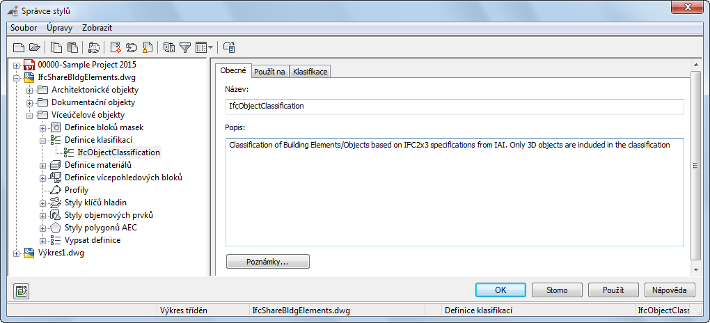 Exportem výkresu do formátu souboru IFC exportujete také definice klasifikace. Definice klasifikace je připojena k typu objektu při importu výkresu.