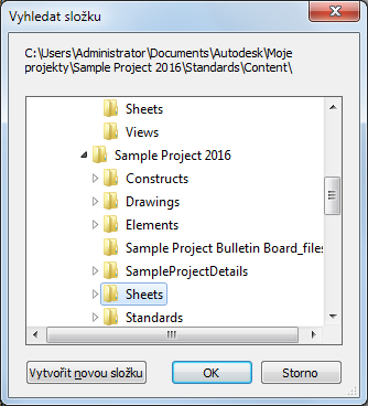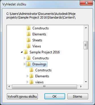 Pokud chcete zadat alternativní umístění složek kategorií na nejvyšší úrovni (konstrukční prvky, prvky, pohledy a listy), je nejlepší začít novým projektem. Nejprve uspořádejte strukturu projektu v programu Průzkumník Windows tak, aby kategorie byly umístěny ve stejné kořenové složce jako soubor APJ. Můžete například uspořádat projekt tak, aby položky Konstrukční prvky, Prvky, Pohledy a Listy byly uloženy v jedné kategorii nazvané Výkresy.