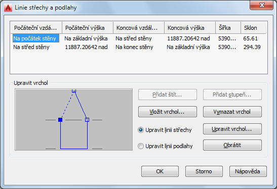 Tabulka v horní části dialogového okna zobrazuje informace o každém vrcholu v obvodovém plášti. Můžete také v seznamu vybrat vrchol, určený k úpravám.